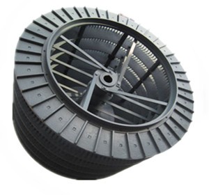 2、在籠形轉(zhuǎn)子與外部殼體之間的中間部位均勻布置了若干塊帶"凹"字形槽的導(dǎo)向葉片,含塵氣體須從導(dǎo)向葉片之間的約15mm左右的若干條縫隙沿切向進(jìn)入由導(dǎo)向葉片與籠形轉(zhuǎn)子組成的環(huán)形分級空間,由于導(dǎo)向葉片的存在徹底消除邊壁效應(yīng),粗灰中細(xì)灰的含量大大降低,分級效率大幅度提高。