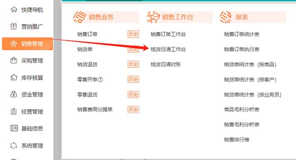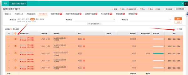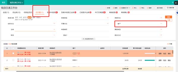 1、點(diǎn)擊【銷(xiāo)售管理】-【錢(qián)貨日清工作臺(tái)】-【待開(kāi)票】,在表頭篩選下要開(kāi)票的客戶(hù)名稱(chēng)。