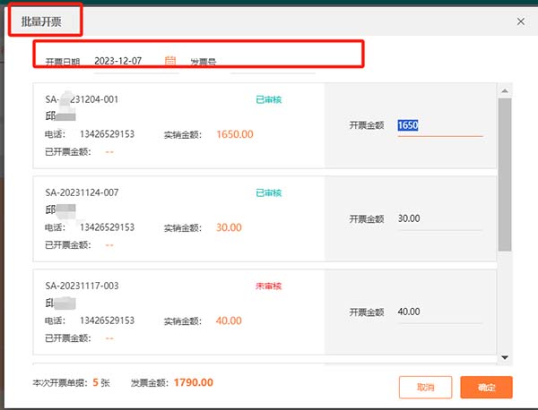 2.勾選要進(jìn)行開(kāi)票的單據(jù),點(diǎn)擊表體右上角的【開(kāi)票】,輸入發(fā)票號(hào)、開(kāi)票日期等數(shù)據(jù),即可對(duì)多張單據(jù)進(jìn)行開(kāi)票處理。