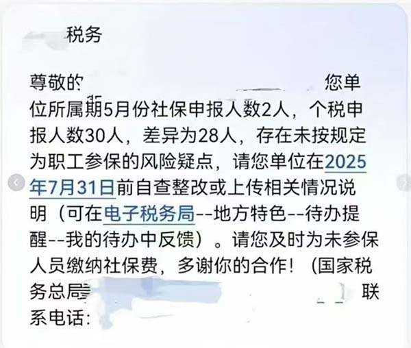 您單位所屬期5月份社保申報人數2人,個稅申報人數30人,差異28人,存在未按規(guī)定為職工參保的風險疑點,請您單位在2025年7月31日前自查整改或上傳相關情況說明。請您及時為參保人員繳納社保費,多謝你的合作!”