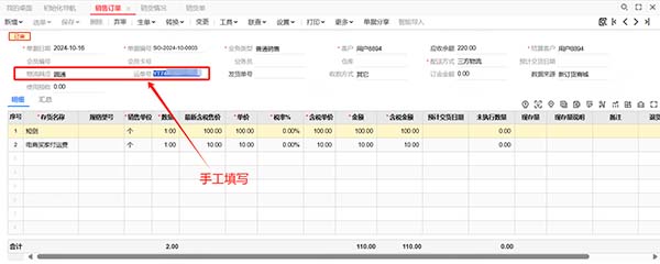 此時銷售訂單的物流網(wǎng)點(diǎn)和運(yùn)單號字段都是空的,選擇網(wǎng)點(diǎn),填寫物流單號